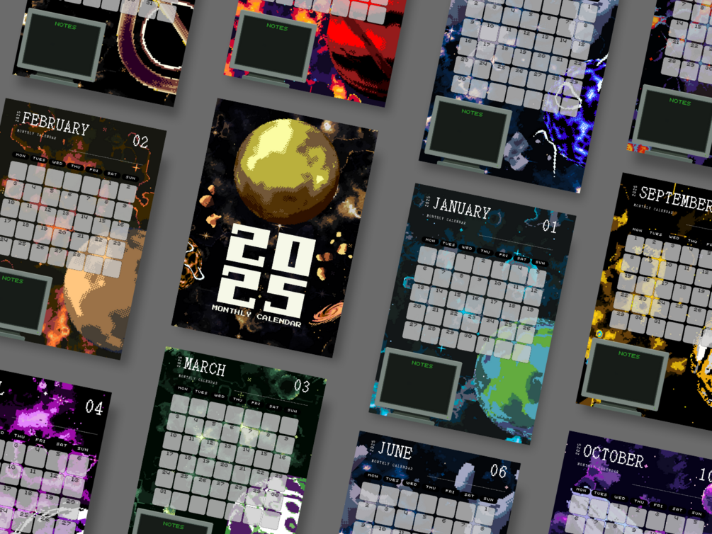 A 12-month printable & animated calendar set with pixel art space vibes.